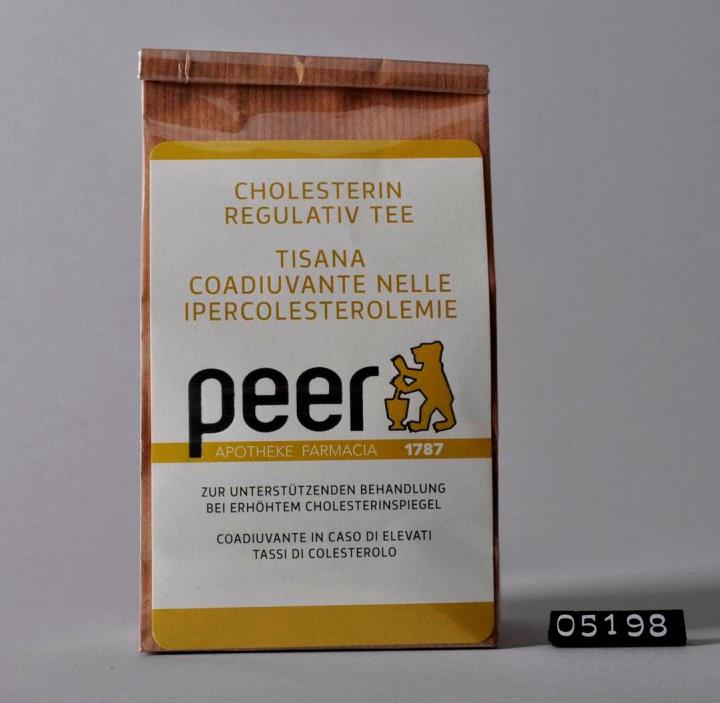 Stehbodensack mit Cellophan: brauner 2-lagiger Blockbodenbeutel mit zwei Seitenfalten und einem festen Bodenblatt, bestehend aus braunem, ungebleichtem Kraftpapier und Cellophan (Polypropylen, transparent) für Kräutermischungen. Befüllt mit Cholesterinregulativtee. Zwischen den beiden Lagen des Säckchens: auf der Vorderseite eingeschobenes Etikett mit Produktnamen, Verwendung, sowie Logo der Peer-Apotheken Brixen und Lana, auf der Rückseite Einschub mit Zusammensetzung, Gebrauchsanleitung und Warnhinweisen. Mündung gefalzt und verschlossen mit einem ca 11 cm langen Verschlussstreifen aus weißem, mit Draht verstärktem Papier. Am Boden selbstklebendes Schild mit Herstellungsdatum, Chargennummer, Aufbrauchfrist, Preis und Barcode.