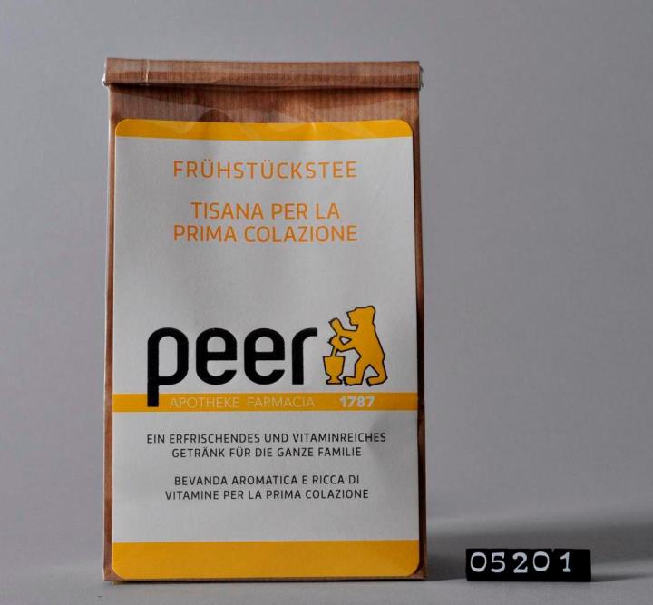 Stehbodensack mit Cellophan: brauner 2-lagiger Blockbodenbeutel mit zwei Seitenfalten und einem festen Bodenblatt, bestehend aus braunem, ungebleichtem Kraftpapier und Cellophan (Polypropylen, transparent) für Kräutermischungen. Befüllt mit Frühstückstee. Zwischen den beiden Lagen des Säckchens: auf der Vorderseite eingeschobenes Etikett mit Produktnamen, Verwendung, sowie Logo der Peer-Apotheken Brixen und Lana, auf der Rückseite Einschub mit Zusammensetzung, Gebrauchsanleitung und Warnhinweisen. Mündung gefalzt und verschlossen mit einem ca 11 cm langen Verschlussstreifen aus weißem, mit Draht verstärktem Papier. Am Boden selbstklebendes Schild mit Herstellungsdatum, Chargennummer, Aufbrauchfrist, Preis und Barcode.
