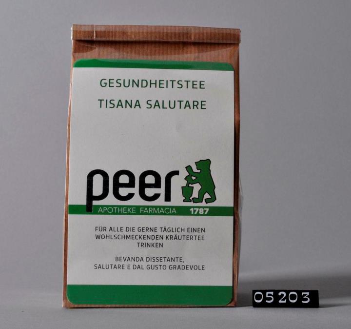 Stehbodensack mit Cellophan: brauner 2-lagiger Blockbodenbeutel mit zwei Seitenfalten und einem festen Bodenblatt, bestehend aus braunem, ungebleichtem Kraftpapier und Cellophan (Polypropylen, transparent) für Kräutermischungen. Befüllt mit Gesundheitstee. Zwischen den beiden Lagen des Säckchens: auf der Vorderseite eingeschobenes Etikett mit Produktnamen, Verwendung, sowie Logo der Peer-Apotheken Brixen und Lana, auf der Rückseite Einschub mit Zusammensetzung, Gebrauchsanleitung und Warnhinweisen. Mündung gefalzt und verschlossen mit einem ca 11 cm langen Verschlussstreifen aus weißem, mit Draht verstärktem Papier. Am Boden selbstklebendes Schild mit Herstellungsdatum, Chargennummer, Aufbrauchfrist, Preis und Barcode.