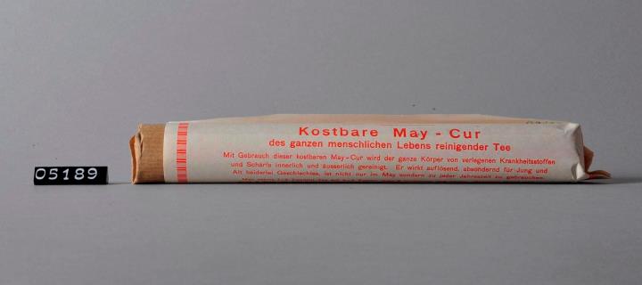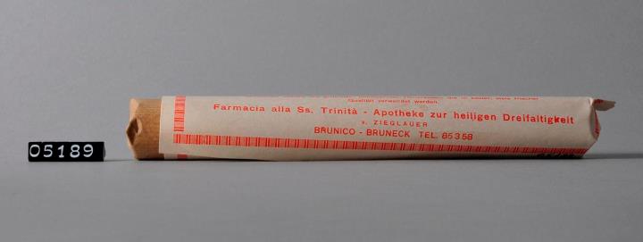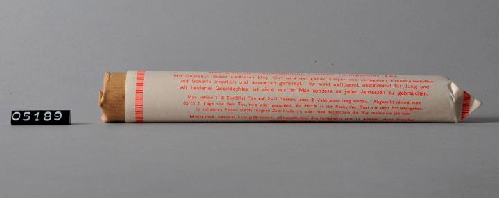 Braunes Packpapier über rundem Hozstab zu einem Zylinder gerollt ein Ende zugefalten und mit der Teemischung kräftig gestopft und am anderen Ende zugefalten. Darüber rot bedrucktes Deckblatt mit Produktnamen und Gebrauchshinweisen. Hergestellt von der Apotheke zur heiligen Dreifaltigkeit v. Zieglauer in Bruneck.