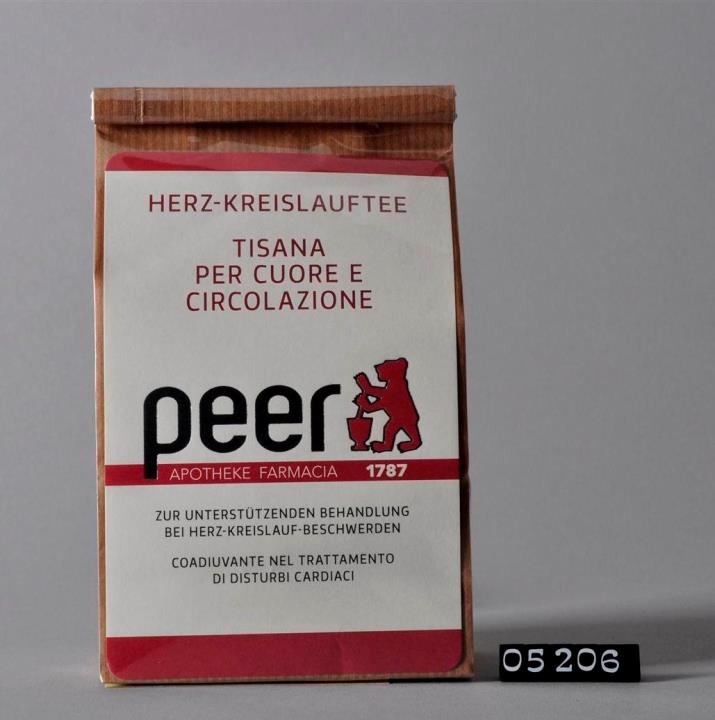 Stehbodensack mit Cellophan: brauner 2-lagiger Blockbodenbeutel mit zwei Seitenfalten und einem festen Bodenblatt, bestehend aus braunem, ungebleichtem Kraftpapier und Cellophan (Polypropylen, transparent) für Kräutermischungen. Befüllt mit Herz- und Kreislauftee. Zwischen den beiden Lagen des Säckchens: auf der Vorderseite eingeschobenes Etikett mit Produktnamen, Verwendung, sowie Logo der Peer-Apotheken Brixen und Lana, auf der Rückseite Einschub mit Zusammensetzung, Gebrauchsanleitung und Warnhinweisen. Mündung gefalzt und verschlossen mit einem ca 11 cm langen Verschlussstreifen aus weißem, mit Draht verstärktem Papier. Am Boden selbstklebendes Schild mit Herstellungsdatum, Chargennummer, Aufbrauchfrist, Preis und Barcode.