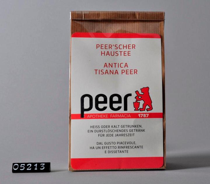Stehbodensack mit Cellophan: brauner 2-lagiger Blockbodenbeutel mit zwei Seitenfalten und einem festen Bodenblatt, bestehend aus braunem, ungebleichtem Kraftpapier und Cellophan (Polypropylen, transparent) für Kräutermischungen. Befüllt mit "Peer'schr Haustee". Zwischen den beiden Lagen des Säckchens: auf der Vorderseite eingeschobenes Etikett mit Produktnamen, Verwendung, sowie Logo der Peer-Apotheken Brixen und Lana, auf der Rückseite Einschub mit Zusammensetzung, Gebrauchsanleitung und Warnhinweisen. Mündung gefalzt und verschlossen mit einem ca 11 cm langen Verschlussstreifen aus weißem, mit Draht verstärktem Papier. Am Boden selbstklebendes Schild mit Herstellungsdatum, Chargennummer, Aufbrauchfrist, Preis und Barcode.