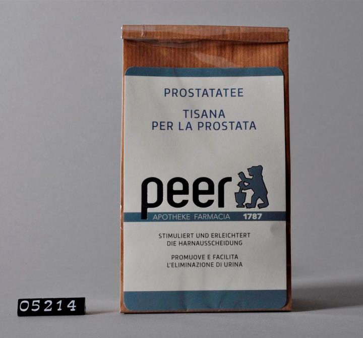 Stehbodensack mit Cellophan: brauner 2-lagiger Blockbodenbeutel mit zwei Seitenfalten und einem festen Bodenblatt, bestehend aus braunem, ungebleichtem Kraftpapier und Cellophan (Polypropylen, transparent) für Kräutermischungen. Befüllt mit Prostatatee. Zwischen den beiden Lagen des Säckchens: auf der Vorderseite eingeschobenes Etikett mit Produktnamen, Verwendung, sowie Logo der Peer-Apotheken Brixen und Lana, auf der Rückseite Einschub mit Zusammensetzung, Gebrauchsanleitung und Warnhinweisen. Mündung gefalzt und verschlossen mit einem ca 11 cm langen Verschlussstreifen aus weißem, mit Draht verstärktem Papier. Am Boden selbstklebendes Schild mit Herstellungsdatum, Chargennummer, Aufbrauchfrist, Preis und Barcode.