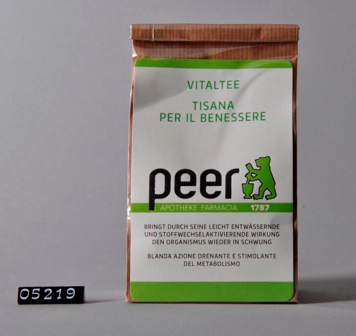 Stehbodensack mit Cellophan: brauner 2-lagiger Blockbodenbeutel mit zwei Seitenfalten und einem festen Bodenblatt, bestehend aus braunem, ungebleichtem Kraftpapier und Cellophan (Polypropylen, transparent) für Kräutermischungen. Befüllt mit Vitaltee. Zwischen den beiden Lagen des Säckchens: auf der Vorderseite eingeschobenes Etikett mit Produktnamen, Verwendung, sowie Logo der Peer-Apotheken Brixen und Lana, auf der Rückseite Einschub mit Zusammensetzung, Gebrauchsanleitung und Warnhinweisen. Mündung gefalzt und verschlossen mit einem ca 11 cm langen Verschlussstreifen aus weißem, mit Draht verstärktem Papier. Am Boden selbstklebendes Schild mit Herstellungsdatum, Chargennummer, Aufbrauchfrist, Preis und Barcode.