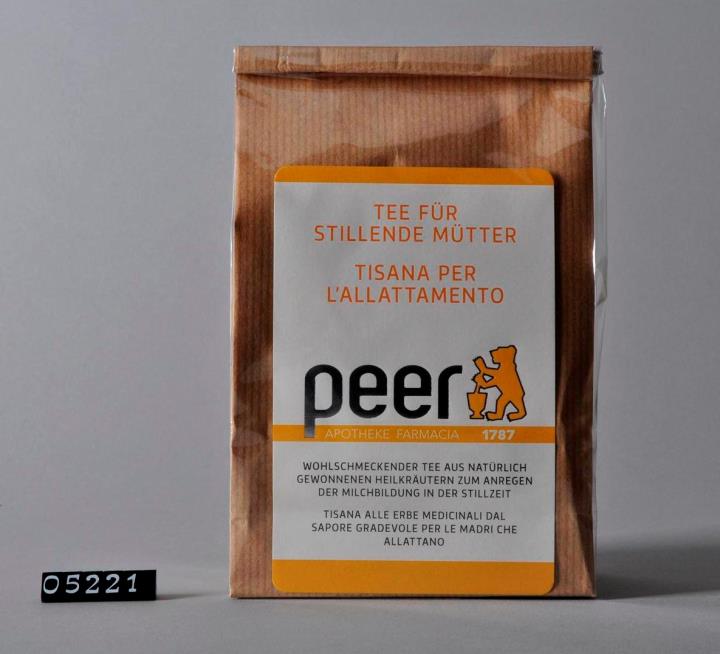 Stehbodensack mit Cellophan: brauner 2-lagiger Blockbodenbeutel mit zwei Seitenfalten und einem festen Bodenblatt, bestehend aus braunem, ungebleichtem Kraftpapier und Cellophan (Polypropylen, transparent) für Kräutermischungen. Befüllt mit Tee für stillende Mütter. Zwischen den beiden Lagen des Säckchens: auf der Vorderseite eingeschobenes Etikett mit Produktnamen, Verwendung, sowie Logo der Peer-Apotheken Brixen und Lana, auf der Rückseite Einschub mit Zusammensetzung, Gebrauchsanleitung und Warnhinweisen. Mündung gefalzt und verschlossen mit einem ca 13 cm langen Verschlussstreifen aus weißem, mit Draht verstärktem Papier. Am Boden selbstklebendes Schild mit Herstellungsdatum, Chargennummer, Aufbrauchfrist, Preis und Barcode.