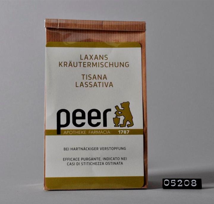 Stehbodensack mit Cellophan: brauner 2-lagiger Blockbodenbeutel mit zwei Seitenfalten und einem festen Bodenblatt, bestehend aus braunem, ungebleichtem Kraftpapier und Cellophan (Polypropylen, transparent) für Kräutermischungen. Befüllt mit Laxans Kräutermischung. Zwischen den beiden Lagen des Säckchens: auf der Vorderseite eingeschobenes Etikett mit Produktnamen, Verwendung, sowie Logo der Peer-Apotheken Brixen und Lana, auf der Rückseite Einschub mit Zusammensetzung, Gebrauchsanleitung und Warnhinweisen. Mündung gefalzt und verschlossen mit einem ca 11 cm langen Verschlussstreifen aus weißem, mit Draht verstärktem Papier. Am Boden selbstklebendes Schild mit Herstellungsdatum, Chargennummer, Aufbrauchfrist, Preis und Barcode.