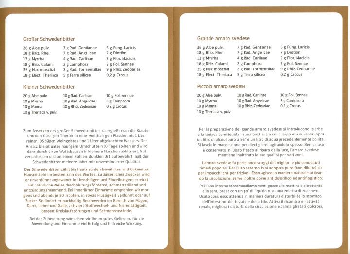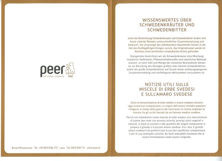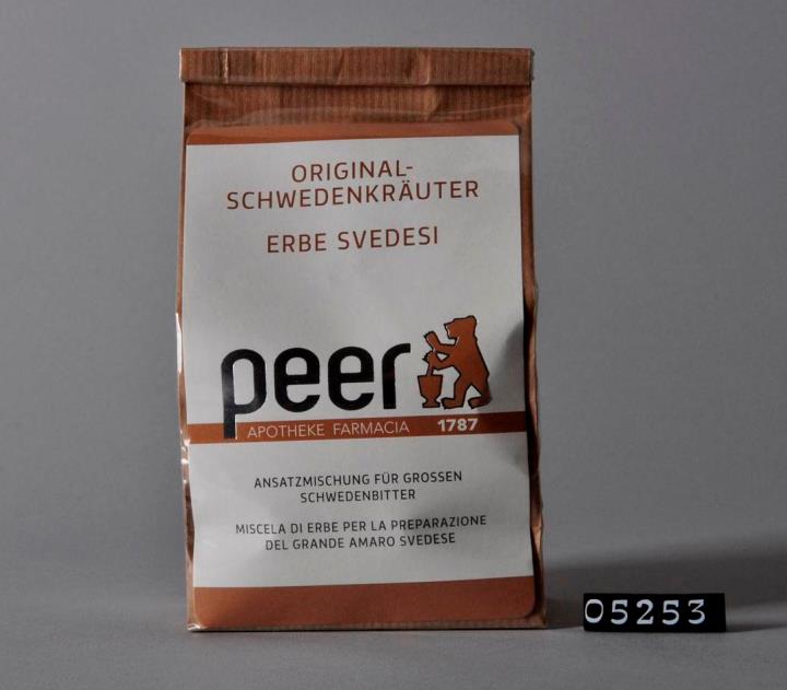Stehbodensack mit Cellophan: brauner 2-lagiger Blockbodenbeutel mit zwei Seitenfalten und einem festen Bodenblatt, bestehend aus braunem, ungebleichtem Kraftpapier und Cellophan (Polypropylen, transparent) für Kräutermischungen. Befüllt mit den Bestandteilen der "Orginal- Schwedenkräuter" zur Herstellung des großen Schwedenbitters. Zwischen den beiden Lagen des Säckchens: auf der Vorderseite eingeschobenes Etikett mit Produktnamen, Verwendung, sowie Logo der Peer-Apotheken Brixen und Lana, auf der Rückseite Einschub mit Zusammensetzung, Gebrauchsanleitung und Warnhinweisen. Mündung gefalzt und verschlossen mit einem ca 11 cm langen Verschlussstreifen aus weißem, mit Draht verstärktem Papier. Am Boden selbstklebendes Schild mit Herstellungsdatum, Chargennummer, Aufbrauchfrist, Preis und Barcode.