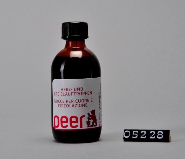 Brauner, zylindrischer Flaschenkörper mit abfallender Schulter der Firma DROP s.r.l.. Mündungsrand verstärkt mit Schraubgewinde und Tropfeinsatz aus Polyethylen. Schwarzer Drehverschluss aus Polypropylen. Bodenrand geriffelt, Flaschenkörper mit Seitennaht. Boden mit Volumenangabe mittels Prägung: 50 unf F23. Farbig bedrucktes, selbstklebendes Etikett mit Produktnamen, Logo der Peer-Apotheke, Zusammensetzung, Chargennummer, Barcode und Preis. Enthält Herz- und Kreislauftropfen.