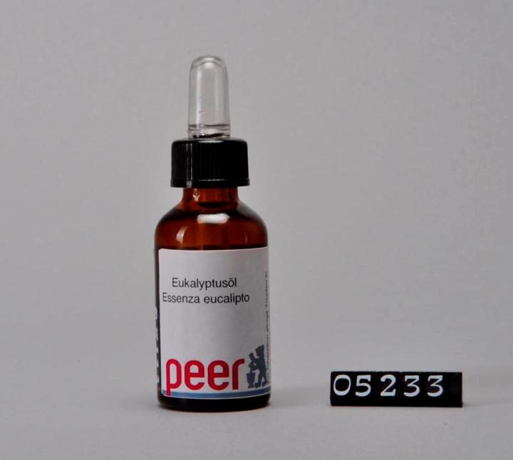 Brauner, runder zylindrischer Flaschenkörper mit abfallender Schulter und Seitennaht. Mündungsrand verstärkt, mit Schraubgewinde. Schwarzer Drehverschluss aus Polypropylen (PP) mit Tropfenzähler aus farlosem Glas und Kunsstoffkappe aus Polyvinylchlorid (PVC). Bodenrand geriffelt. Bodenprägung: 20 und 53. Enthält Eukalyptusöl.