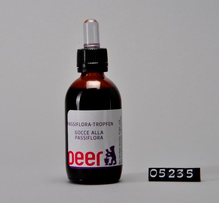 Brauner, runder zylindrischer Flaschenkörper mit abfallender Schulter und Seitennaht. Mündungsrand verstärkt, mit Schraubgewinde. Schwarzer Sicherheits-Drehverschluss aus Polypropylen (PP) mit Tropfenzähler aus farlosem Glas und Kunsstoffkappe aus Polyvinylchlorid (PVC). Bodenrand geriffelt. Bodenprägung: 50 und F 73. Enthält zusammengesetzte Passiflora Tropfen gegen nervöse Unruhe.