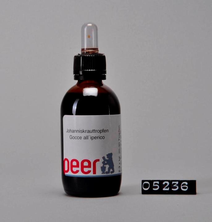 Brauner, runder zylindrischer Flaschenkörper mit abfallender Schulter und Seitennaht. Mündungsrand verstärkt, mit Schraubgewinde. Schwarzer Sicherheits-Drehverschluss aus Polypropylen (PP) mit Tropfenzähler aus farlosem Glas und Kunsstoffkappe aus Polyvinylchlorid (PVC). Bodenrand geriffelt. Bodenprägung: 50 und F 62 (?). Enthält Johanniskrauttinktur.