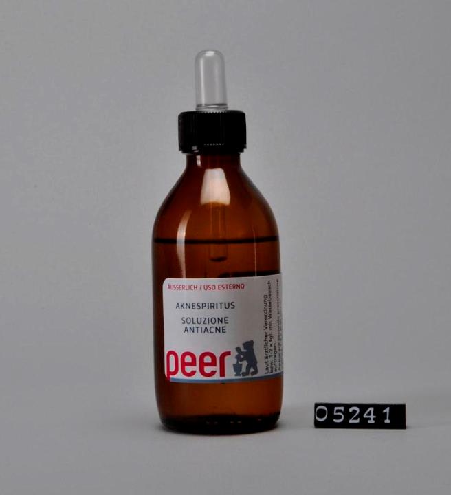 Brauner, runder zylindrischer Flaschenkörper mit abfallender Schulter und Seitennaht. Mündungsrand verstärkt, mit Schraubgewinde. Schwarzer Drehverschluss aus Polypropylen (PP) mit Tropfenzähler aus farlosem Glas und Kunsstoffkappe aus Polyvinylchlorid (PVC). Bodenrand geriffelt. Seitliche Prägung: 125, 41 und Punkte. Enthält eine Lösung zum Auftragen bei Akne.