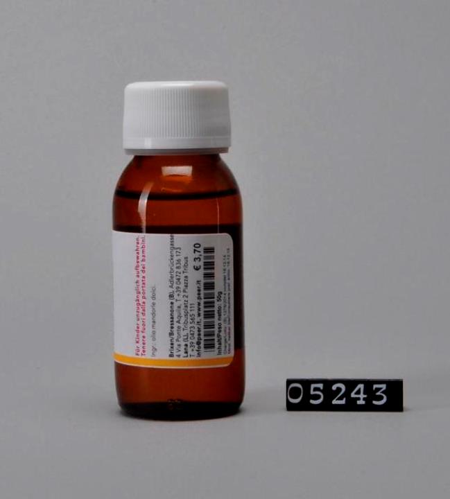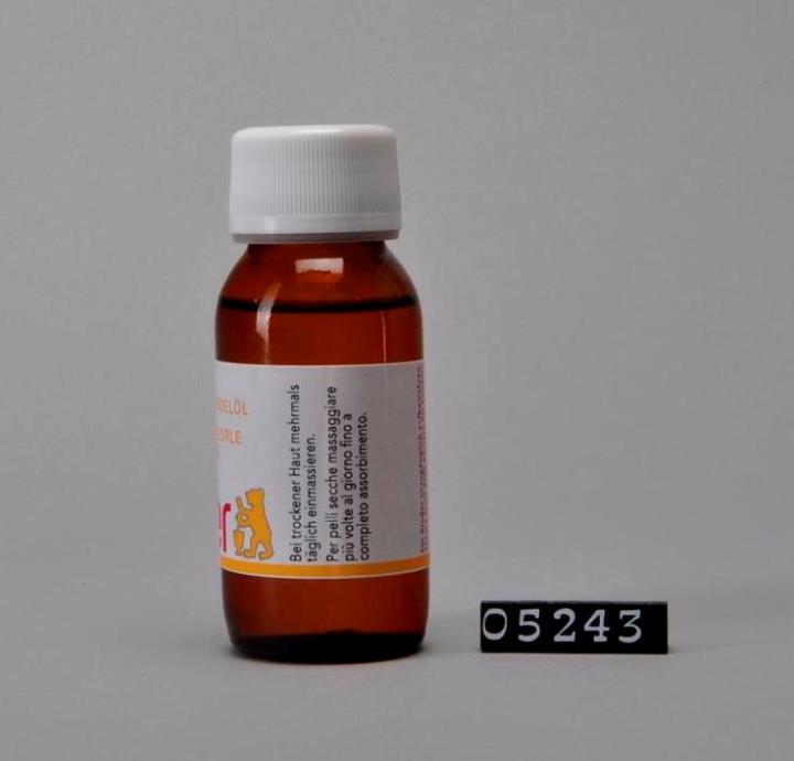 Brauner, zylindrischer Flaschenkörper mit abfallender Schulter und Seitennaht. Mündung verstärkt und Schraubgewinde. Weißer Sicherheitsdrehverschluss mit Dichtung aus PE-LD (LDPE). Ohne Dosierbecher. Seitliche Prägung des Volumens: 50. Bodenrand geriffelt, mit Prägung. Enthält süßes Mandelöl zum Einmassieren bei trockener Haut..