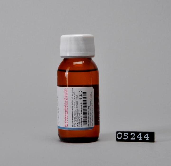 Brauner, zylindrischer Flaschenkörper mit abfallender Schulter und Seitennaht. Mündung verstärkt und Schraubgewinde. Weißer Sicherheitsdrehverschluss mit Dichtung aus PE-LD (LDPE). Ohne Dosierbecher. Seitliche Prägung des Volumens: 50. Bodenrand geriffelt, mit Prägung. Enthält 70%igen unvergällten Weingeist.
