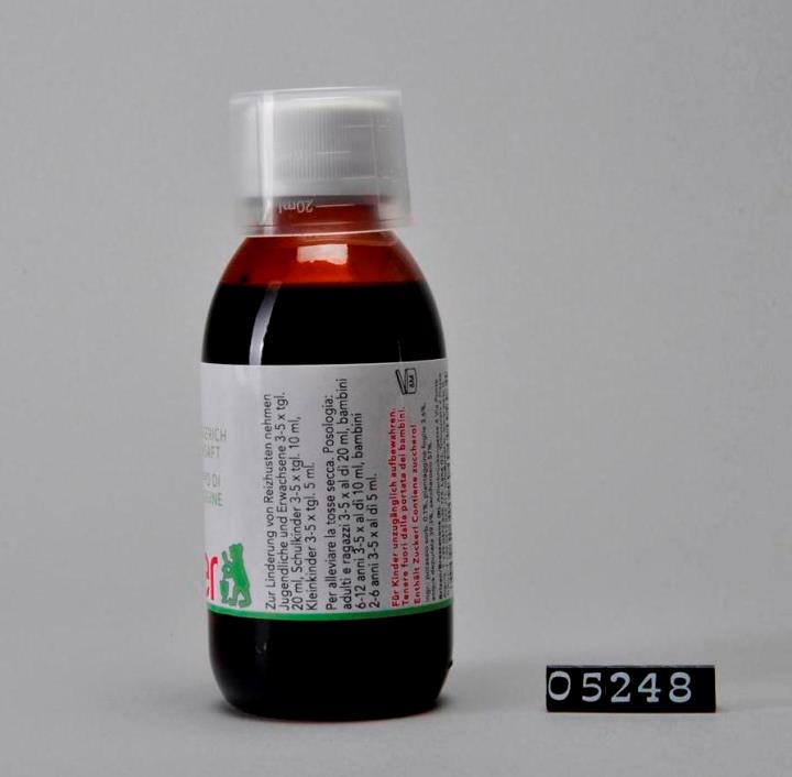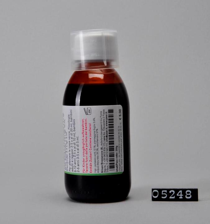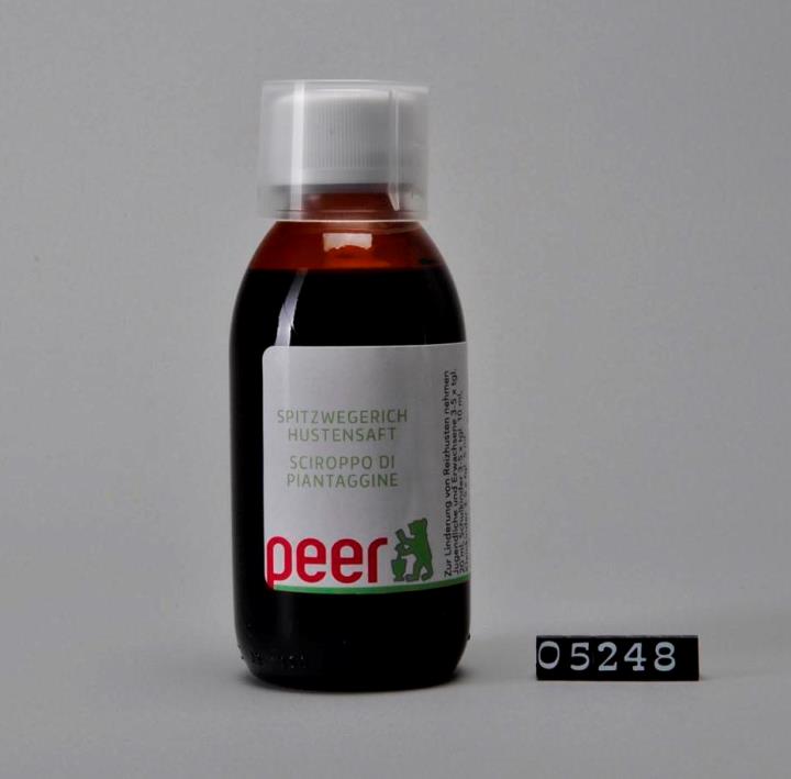 Brauner, zylindrischer Flaschenkörper mit abfallender Schulter und Seitennaht. Mündung verstärkt und Schraubgewinde. Weißer Sicherheitsdrehverschluss mit Dichtung aus PE-LD (LDPE). Mit aufgestecktem Dosierbecher. Seitliche Prägung des Volumens: 150. Bodenrand geriffelt. Enthält Spitzwegerichsaft zur Linderung von Reizhusten.