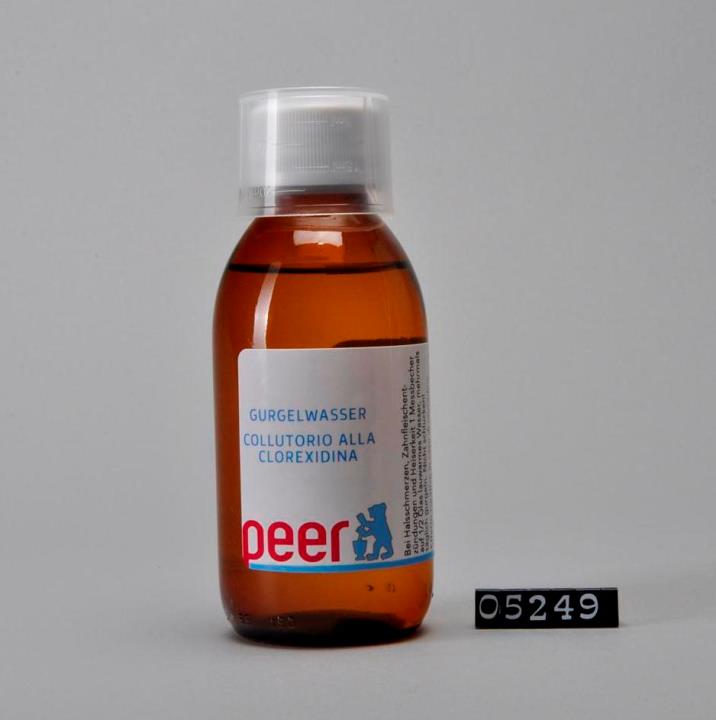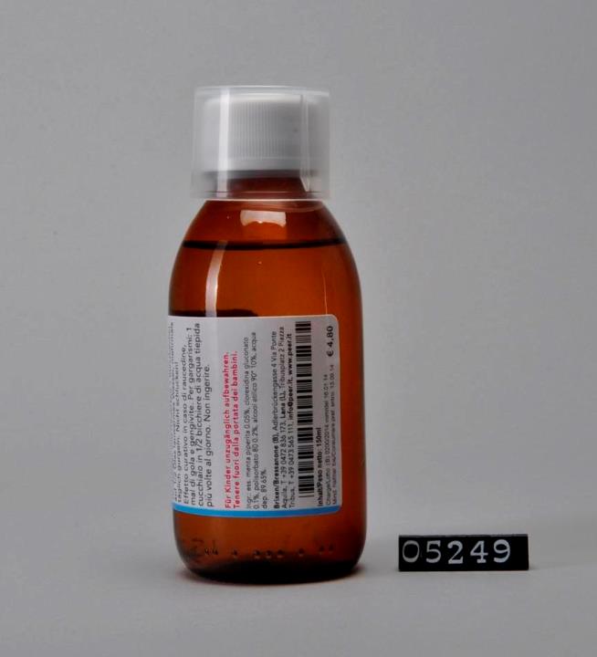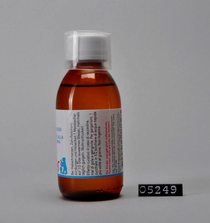 Brauner, zylindrischer Flaschenkörper mit abfallender Schulter und Seitennaht. Mündung verstärkt und Schraubgewinde. Weißer Sicherheitsdrehverschluss mit Dichtung aus PE-LD (LDPE). Mit aufgestecktem Dosierbecher. Seitliche Prägung des Volumens: 150. Bodenrand geriffelt. Enthält Gurgelwasser, hilft bei Halsschmerzen, Zahnfleischentzündungen und Heiserkeit.
