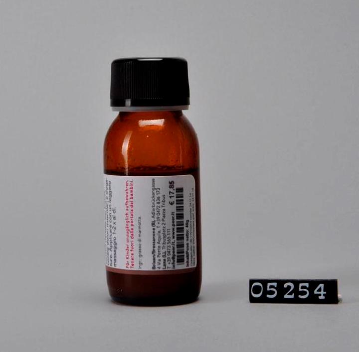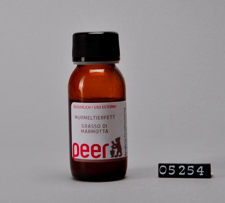 Brauner, zylindrischer Flaschenkörper mit abfallender Schulter und Seitennaht. Mündung verstärkt und Schraubgewinde. Schwarzer Sicherheitsdrehverschluss mit Dichtung aus PE-LD (LDPE). Seitliche Prägung des Volumens: 50. Bodenrand geriffelt, mit Prägung. Enthält Murmeltieröl, bewährtes Einreibungsmittel bei Verstauchungen, Sportverletzungen und nach Knochenbrüchen.