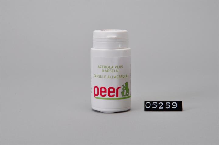 Runde Dose aus weißem Kunststoff mit Sicherheits-Drehverschluss für Kapseln. Seitliche Naht. Boden mit geteiltem Standring. Deckel bedruckt mit Logo der Peer Apotheke, Brixen. Boden geprägt mit Volumenangabe 50 und Recycling-Code für PD-HE. Enthält 30 Acerola Kapseln zur Stärkung des Immunsystems bei grippalen Infekten.