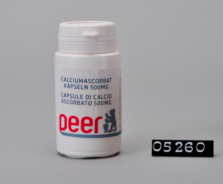 Runde Dose aus weißem Kunststoff mit Sicherheits-Drehverschluss für Kapseln. Seitliche Naht. Boden mit geteiltem Standring. Deckel bedruckt mit Logo der Peer Apotheke, Brixen. Boden geprägt mit Volumenangabe 50 und Recycling-Code für PD-HE. Enthält 30 Kapseln Calciumascorbat, einzunehmen laut ärztlicher Verordnung bei Vitamin C Mangel.