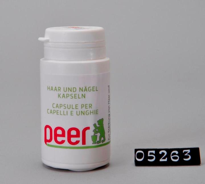 Runde Dose aus weißem Kunststoff mit Sicherheits-Drehverschluss für Kapseln. Seitliche Naht. Boden mit geteiltem Standring. Deckel bedruckt mit Logo der Peer Apotheke, Brixen. Boden geprägt mit Volumenangabe 50 und Recycling-Code für PD-HE. Enthält 30 Kapseln zur Stärkung von Haar- und Nagelstruktur.
