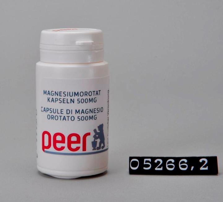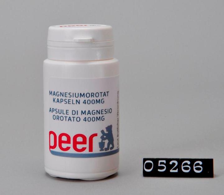 Runde Dose aus weißem Kunststoff mit Sicherheits-Drehverschluss für Kapseln. Seitliche Naht. Boden mit geteiltem Standring. Deckel bedruckt mit Logo der Peer Apotheke, Brixen. Boden geprägt mit Volumenangabe 50 und Recycling-Code für PD-HE. Enthält 30 Kapseln zur Magnesiumorotat zu 400mg bzw. 500mg. Zu verwenden laut ärztlicher Verrdnung.