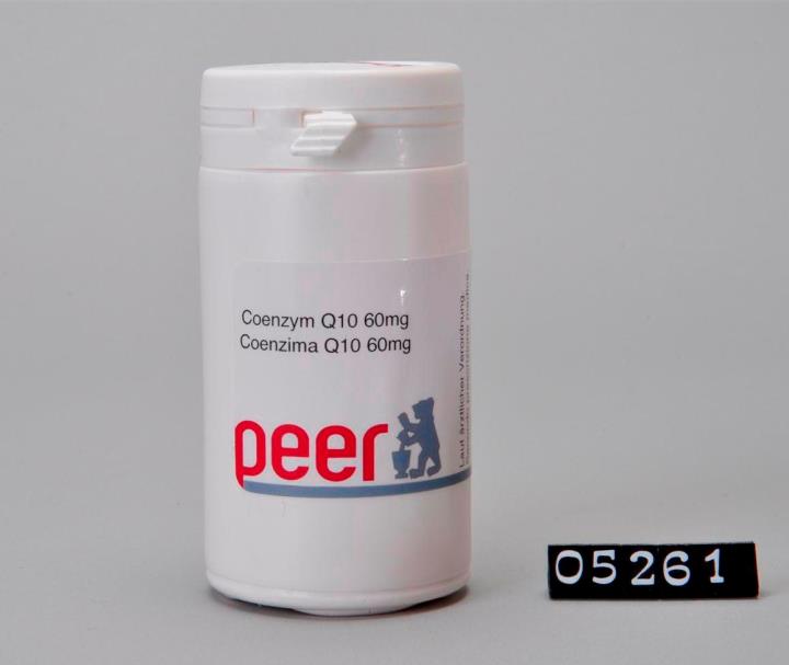 Runde Dose aus weißem Kunststoff mit Sicherheits-Drehverschluss für Kapseln. Seitliche Naht. Boden mit geteiltem Standring. Deckel bedruckt mit Logo der Peer Apotheke, Brixen. Boden geprägt mit Volumenangabe EP 100 und Recycling-Code für PD-HE. Enthält 60 Kapseln Coenzym Q 10 60mg. Zur Verwendung laut ärztlicher Verordnung.