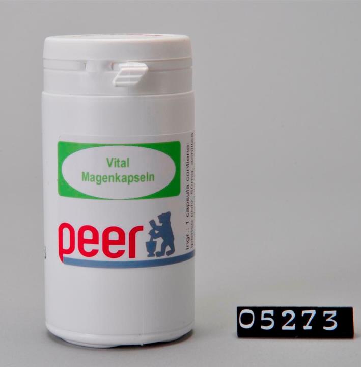 Runde Dose aus weißem Kunststoff mit Sicherheits-Drehverschluss für Kapseln. Seitliche Naht. Boden mit geteiltem Standring. Deckel bedruckt mit Logo der Peer Apotheke, Brixen. Boden geprägt mit Volumenangabe EP 100 und Recycling-Code für PD-HE. Enthält 60 Kapseln. Zur Beruhigung des Magens.