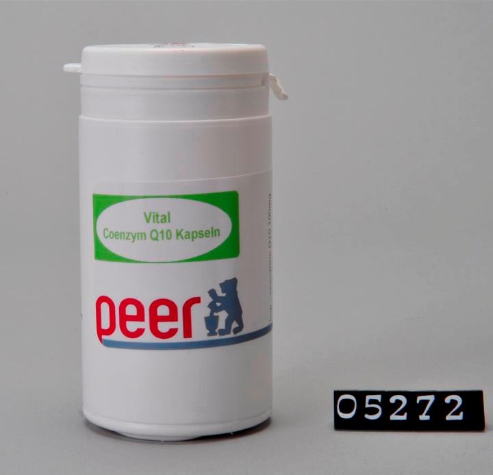 Runde Dose aus weißem Kunststoff mit Sicherheits-Drehverschluss für Kapseln. Seitliche Naht. Boden mit geteiltem Standring. Deckel bedruckt mit Logo der Peer Apotheke, Brixen. Boden geprägt mit Volumenangabe EP 100 und Recycling-Code für PD-HE. Enthält 60 Kapseln.