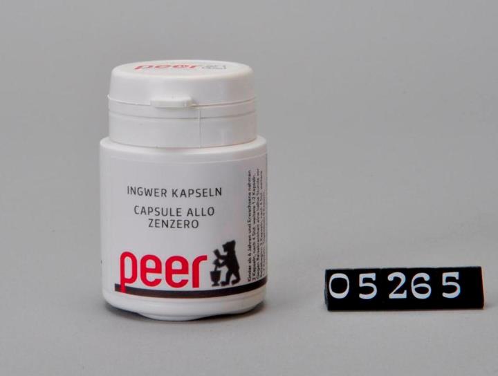 Runde Dose aus weißem Kunststoff mit Sicherheits-Drehverschluss für Kapseln. Seitliche Naht. Boden mit geteiltem Standring. Deckel bedruckt mit Logo der Peer Apotheke, Brixen. Boden geprägt mit Volumenangabe EP 30 und Recycling-Code für PD-HE. Enthält 10 Kapseln Ingwerextrakt 5% zu 250mg. Helfen bei Reisekrankheit.