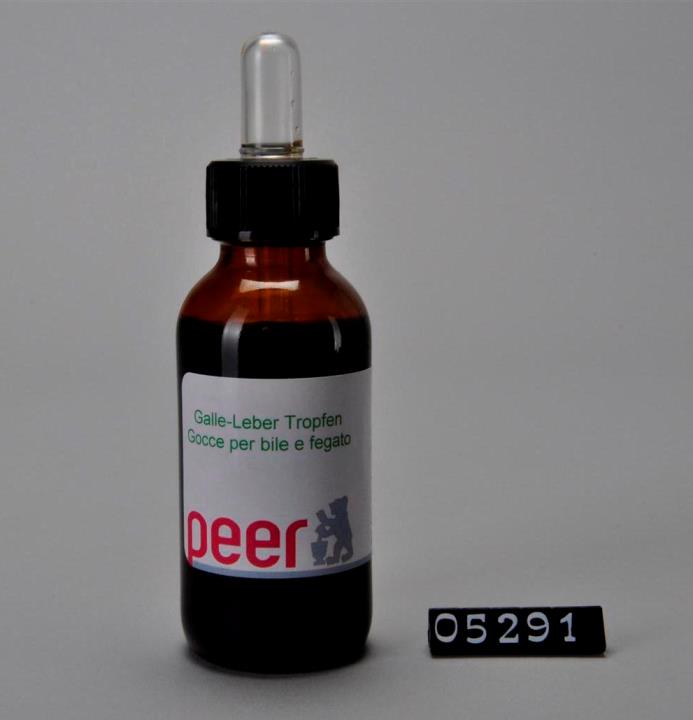 Brauner, runder zylindrischer Flaschenkörper mit abfallender Schulter und Seitennaht. Mündungsrand verstärkt, mit Schraubgewinde. Schwarzer Drehverschluss aus Polypropylen (PP) mit Tropfenzähler aus farlosem Glas und Kunsstoffkappe aus Polyvinylchlorid (PVC). Bodenrand geriffelt. Bodenprägung: 1 und Blumensymbol. Wirksam bei Leber- und Gallebeschwerden..