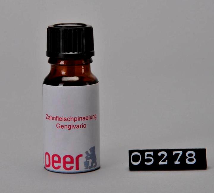 Brauner, zylindrischer Flaschenkörper, verstärkter Mündungsrand mit Schraubgewinde. Schwarzer Kunststoffverschluss mit Spatel aus Poliethylen. Bodenrand geriffelt. Mit Prägung der Volumenangabe 10ml. Zum Pinseln bei Zahnfleischentzündungen.