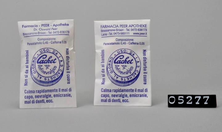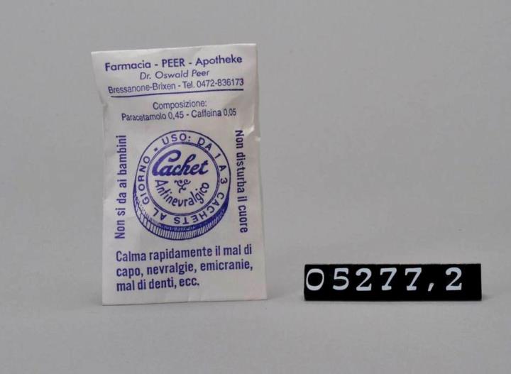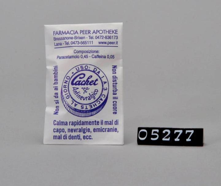 Weiße, kleine, geklebte Papiertüte. Blau bedruckt. Rückseite aufgeklebtes Etikett mit Barcode, Herstellungsdatum, Chargennummer und Preis. Enthält 4 Kapseln Paracetamol mit Coffein. Verwendet als Schmerzmittel.