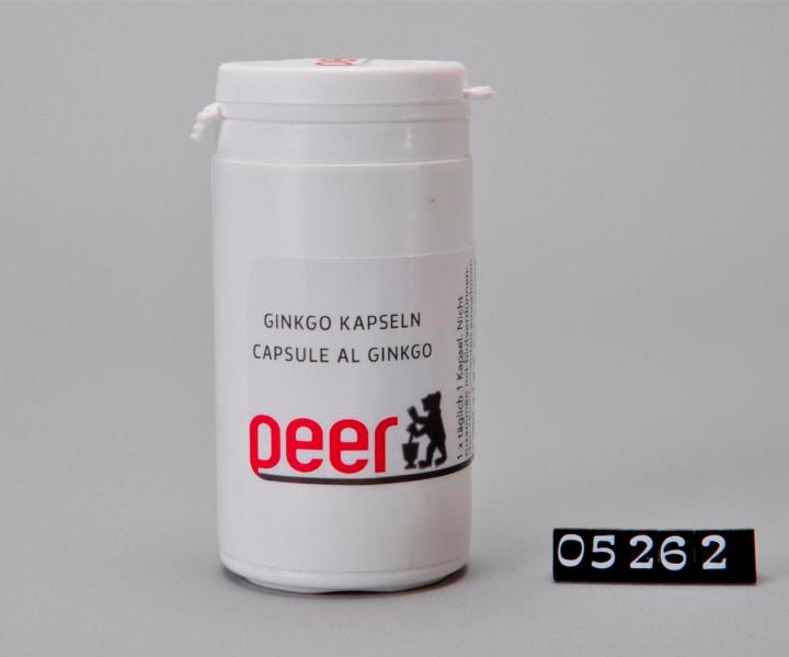 Runde Dose aus weißem Kunststoff mit Sicherheits-Drehverschluss für Kapseln. Seitliche Naht. Boden mit geteiltem Standring. Deckel bedruckt mit Logo der Peer Apotheke, Brixen. Boden geprägt mit Volumenangabe EP 100 und Recycling-Code für PD-HE. Enthält 60 Kapseln. Zur Unterstützung des peripheren Kreislaufes.