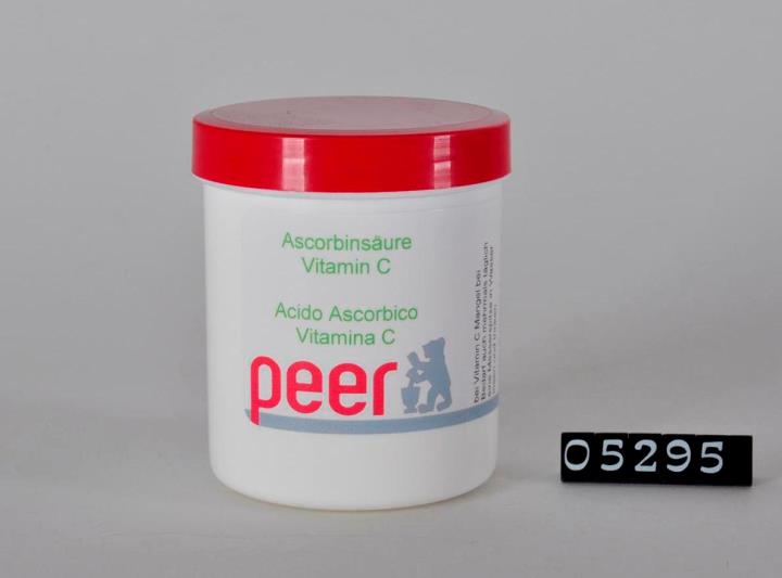 Weiße Salbendose mit rotem Schraubverschluss aus Polypropylen (PP) mit Standring. Bodenprägung: 100, 125ml und Receyclingsymbol für PP. Enthält 100g Ascorbinsäure, zu verwenden bei Vitamin C Mangel.
