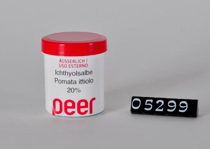 Weiße Salbendose mit rotem Schraubverschluss aus Polypropylen (PP) mit Standring. Bodenprägung: 20, 25ml und Receyclingsymbol für PP. Enthält 20g, 20prozentige Ichtyolsalbe.