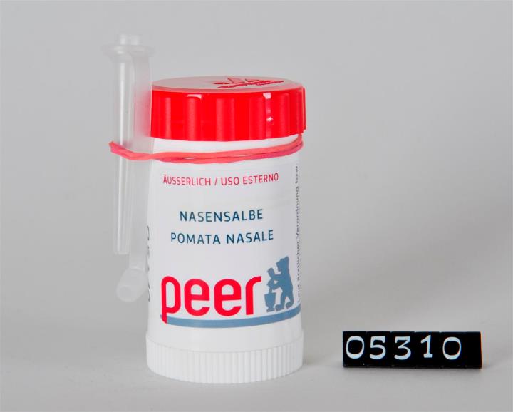 TOPITEC® Kruke = aponorm® Drehdosierkruke. Krukenkörper weiß mit aufgeschraubtem Deckel aus PP, rot. Hubboden aus PE. Drehspindelfuß aus POM (Polyoxymethylen) mit aufgeschraubter Spindelmutter aus PE. Diese Kruken eignen sich für die direkte Herstellung der Salben und Emulsionen in der Kruke mittels TOPITEC® AUTOMATIC Mischsystem sowie zur Abgabe, Aufbewahrung und Entnahme von halbfesten Salbenzubereitungen bishin zu Pasten. Mit Salben-Kanüle aus PP natur, zum Einsetzen in die Entnahmeöffnung. Enthält 30g Nasensalbe.