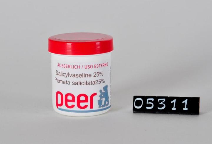 Weiße Salbendose mit rotem Schraubverschluss aus Polypropylen (PP), mit Standring. Bodenprägung: 20, 25ml und Receyclingsymbol für PP. Enthält 20g Salicylvaseline 25%. Zu Verwenden lt. ärztlicher Verordnung. Wird noch als 10 und 20%ige Salbe hergestellt.