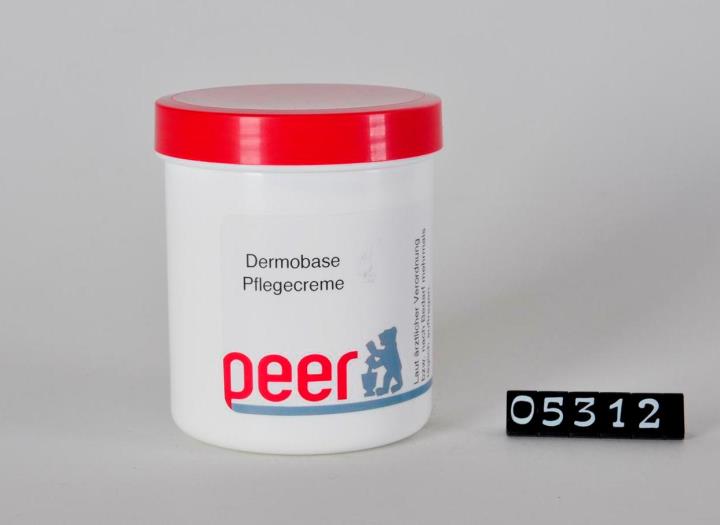 Weiße Salbendose mit rotem Schraubverschluss aus Polypropylen (PP), mit Standring. Bodenprägung: 100, 125ml und Receyclingsymbol für PP. Enthält 100g Pflegecreme welche zu gleichen Teilen aus Dermobase grassa und magra besteht. Zum Auftragen auf trockene Haut.