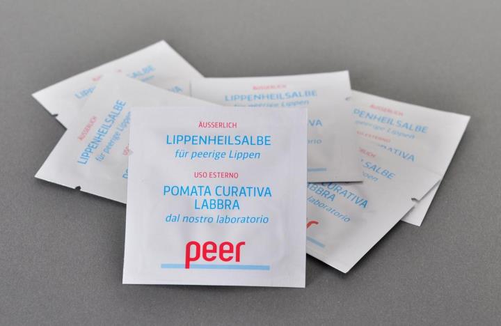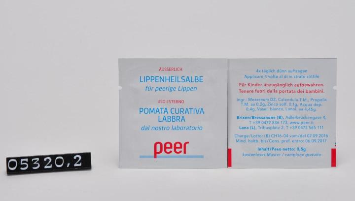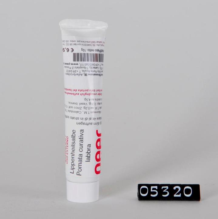 Weißer, zylindrischer Körper aus LDPE mit aufgeschraubtem Verschluss und versiegelter Mündung mittels Metallfolie. Am Tubenende gefüllt und anschließend verschweißt. Signiert. Enthält 10g Lippenheilsalbe, dünn aufzutragen bei spröden Lippen und bei Lippenherpes. Dazu Probebriefchen der Lippenheilsalbe für "peerige" Lippen.