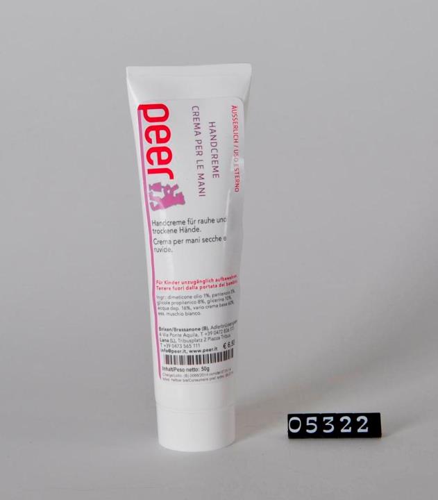Weißer, zylindrischer Körper aus LDPE mit aufgeschraubtem Verschluss und versiegelter Mündung mittels Metallfolie. Über das Tubenende gefüllt und anschließend verschweißt. Signiert. Enthält 50g Creme gegen rauhe und trockene Hände.