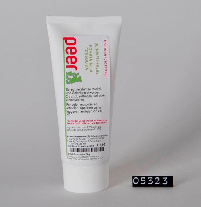 Weißer, zylindrischer Körper aus LDPE mit aufgeschraubtem Verschluss und versiegelter Mündung mittels Metallfolie. Über das Tubenende gefüllt und anschließend verschweißt. Signiert. Enthält 70g Beinwellsalbe, aufzutragen bei schmwerzhaften Muskel- und Gelenksbeschwerden.