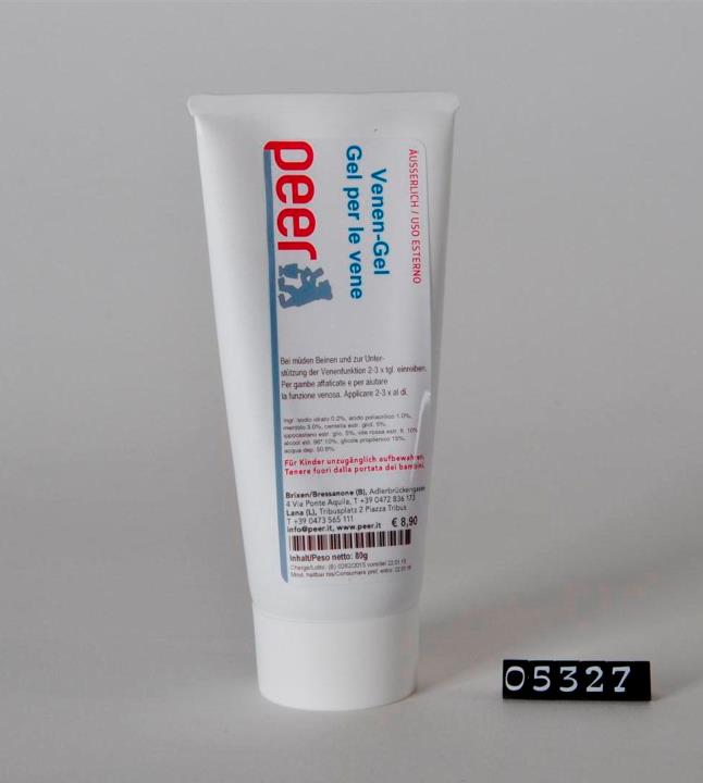 Weißer, zylindrischer Körper aus LDPE mit aufgeschraubtem Verschluss und versiegelter Mündung mittels Metallfolie. Über das Tubenende gefüllt und anschließend verschweißt. Signiert. Enthält 80g Venengel zur Unterstützung der Venenfunktion und bei müden Beinen.