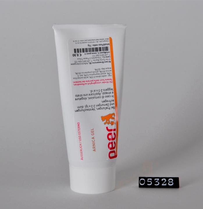 Weißer, zylindrischer Körper aus LDPE mit aufgeschraubtem Verschluss und versiegelter Mündung mittels Metallfolie. Über das Tubenende gefüllt und anschließend verschweißt. Signiert. Enthält 70g Arnikagel zur Anwendung bei Prellungen, Verstauchungen und Zerrungen.