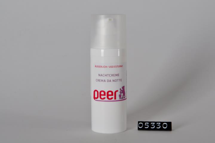 Weißes, zylinderförmiges Kunststoffgefäß mit Dispenser und satinierter Schutzkappe aus Polypropylen. Vertrieben von der Firma Farmalobor aus Canosa di Puglia (BT) unter dem Namen Airless LS50. Enthält 45 g Nachtcreme.