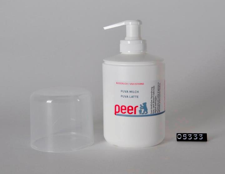 Zylinderförmige Flasche, weiß, aus PE mit Lotio-Pumpe zur Aufbewahrung und Abgabe von dünnflüssigen, viskosen Medien. Seitennaht. Farblose, transparente Kappe zum Aufstecken. Boden leicht nach innen gewölbt mit aufgeprägtem Code für PE im sechseckigem Rahmen. Enthält 250ml PUVA Milch zum Auftragen lt. ärztlicher Verordnung auf die betreffenden Körperstellen.