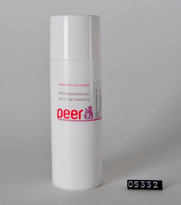 Zylinderförmige Kunststoffflasche, satiniert, aus PE. Ausguss mit Spritzeinsatz zum Stecken. Seitennaht. Weiße Kappe mit innenliegendem Schraubverschluss. Boden leicht nach innen gewölbt mit aufgeprägtem Code für PE und Abfallzeichen (Tidyman) als Aufforderung zur umweltgerechten Entsorgung. Enthält 200g Reinigungsmilch zum Entfernen von Make-up und Haut-Unreinheiten.