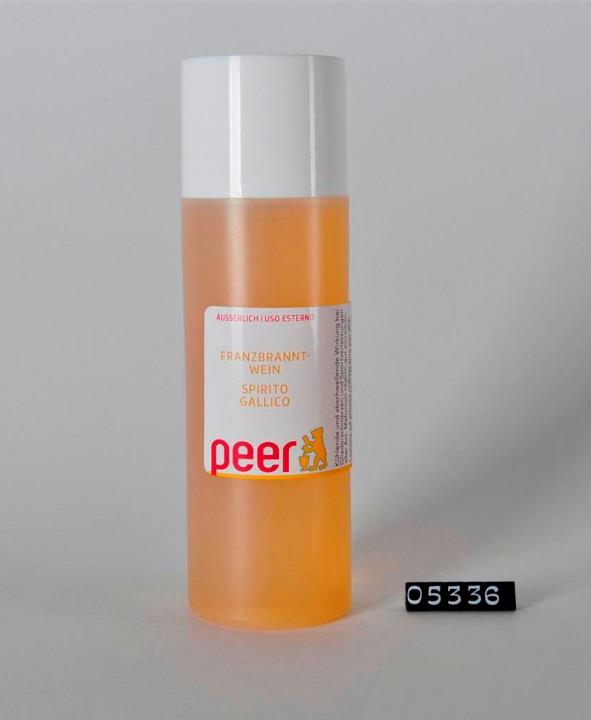 Zylinderförmige Kunststoffflasche, satiniert, aus PE. Ausguss mit Spritzeinsatz zum Stecken. Seitennaht. Weiße Kappe mit innenliegendem Schraubverschluss. Boden leicht nach innen gewölbt mit aufgeprägtem Code für PE und Abfallzeichen (Tidyman) als Aufforderung zur umweltgerechten Entsorgung. Enthält 250ml Franzbranntwein für kühlende und abschwellende Einreibungen bei Gliederschmerzen und Sportverletzungen.