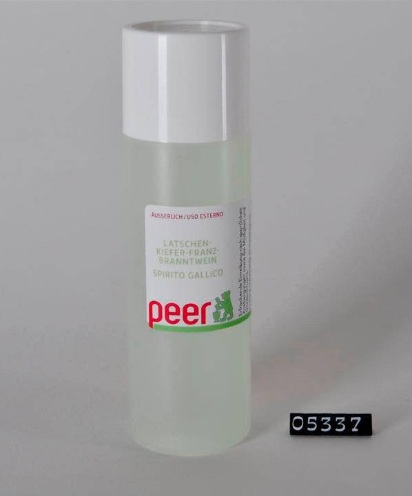 Zylinderförmige Kunststoffflasche, satiniert, aus PE. Ausguss mit Spritzeinsatz zum Stecken. Seitennaht. Weiße Kappe mit innenliegendem Schraubverschluss. Boden leicht nach innen gewölbt mit aufgeprägtem Code für PE und Abfallzeichen (Tidyman) als Aufforderung zur umweltgerechten Entsorgung. Enthält 250ml Franzbranntwein mit Latschenöl für erfrischende Einreibungen nach sportlicher Anstrengung sowie bei Müdigkeit und Gliederschwere.