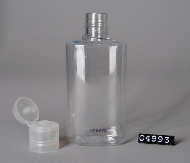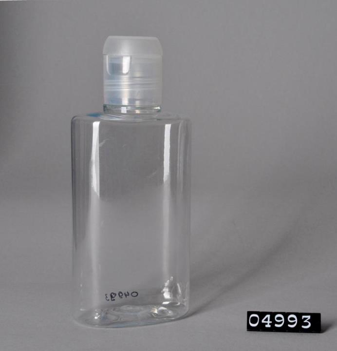 Im Grundriss ovale, transparente Kunsstoffflasche. Schraubverschluss aus satiniertem Kunststoff mit kleiner Öffnung und aufklappbarer Schutzkappe mit innenseitiger Prägung (VETROCUP). Boden leicht eingewölbt mit Prägung des Tidymen, Recyclingsymbol für Pet und Hersteller. Hergestellt von der Firma Vetrocap. Verwendet für Kräuterhaarwasser.