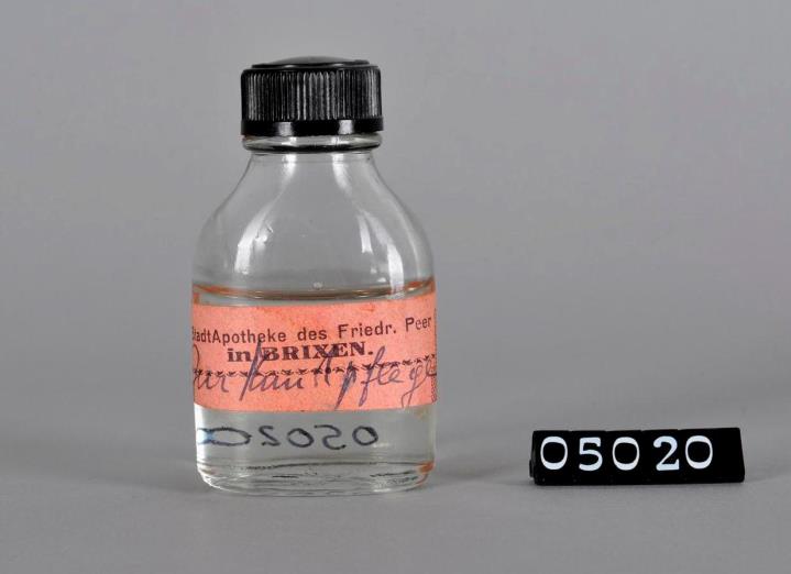Im Grundriss ovale, farblose Glasflasche (Neoval), schwarzer, geriffelter Schraubverschluss mit Plastikeinsatz. Enthält Mandelöl. Seitliche Naht. Nach innen gewölbter Boden mit Prägung. Etikett der StadtApotheke des Friedrich Peer in Brixen. Beschriftet mit Füllfeder von Ignaz Peer.